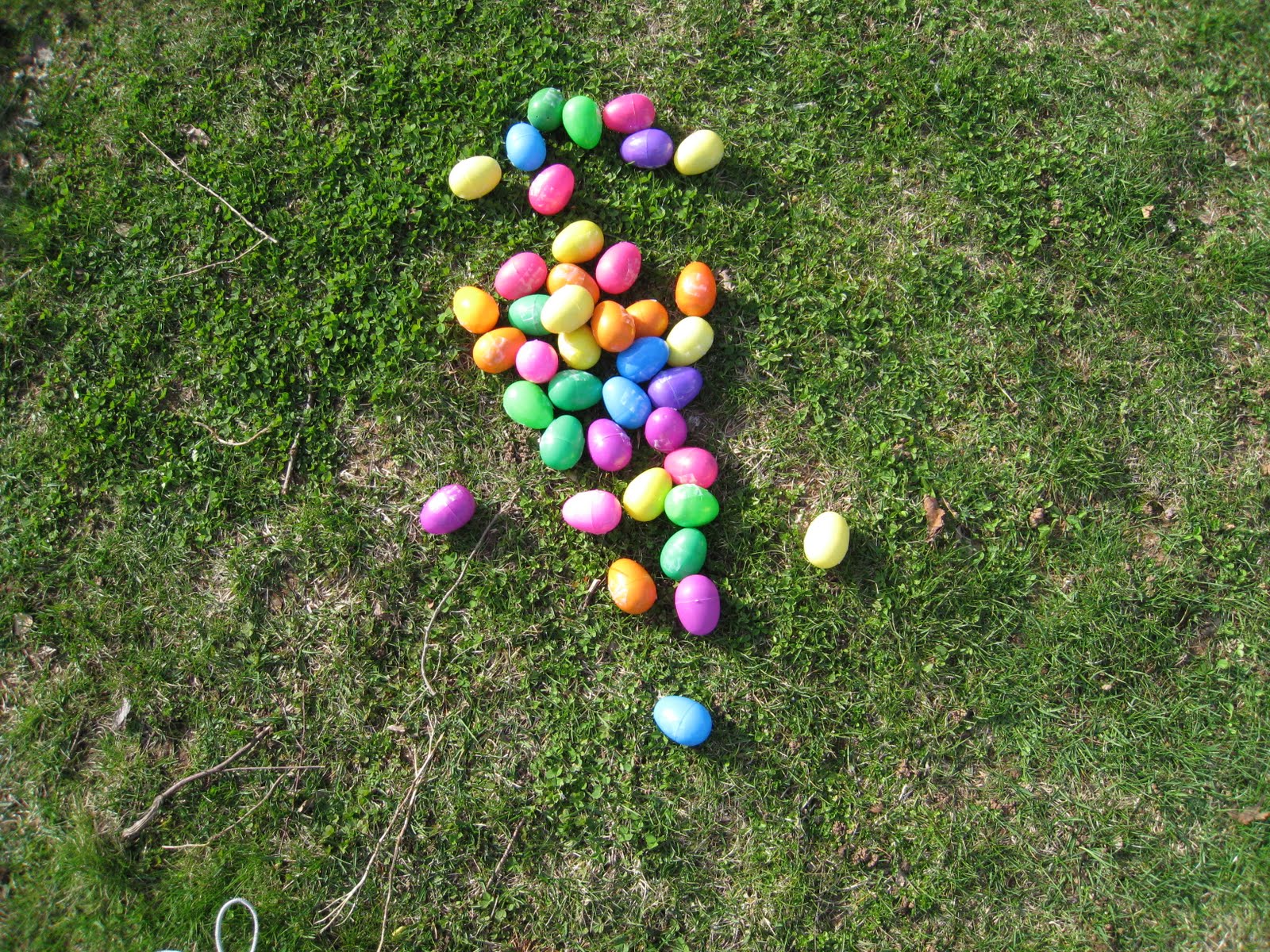 We are a mixed religion family so we celebrate 2 religions worth of holidays! There is a major Easter egg hunt every year, from dollar bills to one very large bill for one lucky hunter! All the kids get 5 eggs, so hiding them is not a big necessity, although you see some up a tree. The bottom picture is the discards, after you take out the money, who needs the shell!