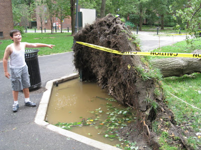 And get out we did. We headed east to the river to survey the aftermath of Ms. Irene. In our community there were some branches down. The ritzier community on the other side of the street however did not fare as well. Huge trees were uprooted. My son helped us determine the damage! We are not experts, but we do surmise that some of the plantings could have been done a little bit deeper, the various root systems that we saw did not seem like they had grown deep enough down into the soil. That is our un-expert opinion!